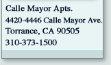 Each spacious Calle Mayor town house is designed to protect the privacy every family cherishes, while offering gracious modern conveniences. Each apartment has its own private entrance, with no one living above or below. Mere minutes from shopping centers, and Southern Californias favorite playgrounds, the location is superbly serene. Located at the Palos Verdes Foothills, the Calle Mayor Apartments are in the finest section of the South Bay. |