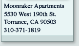 Spacious 1 or 2 bedroom apartments with abundant closets and cupboard space make the Moonraker Apartments an excellent place to call home. Located minutes from the beach and shopping centers, this area combines beauty and convenience. Take a plunge in our pool, relax in our gazebo or enjoy a game of billiards in the recreation room. Come see why the Moonraker is the jewel of the South Bay. |