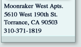 Spacious 2 bedroom apartments with lots of closets and cupboard space make the Moonraker West Apartments an excellent place to call home. Located minutes from the beach and shopping centers, this area combines beauty and convenience. Come see why Moonraker West is the jewel of the South Bay. |
