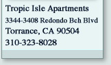 Very large single, 1 or 2 bedroom apartments in North Torrance. Located just minutes from the 405 and 91 freeways, and seconds from El Camino College, Tropic Isle apartments are perfect for todays or tomorrows professional. Take a dip in one of our 2 pools or cook a meal on our gas-powered barbeques. Each unit comes with covered parking, and includes a storage area. Come see why the Tropic Isle apartments are a perfect place for you and your family to reside. |